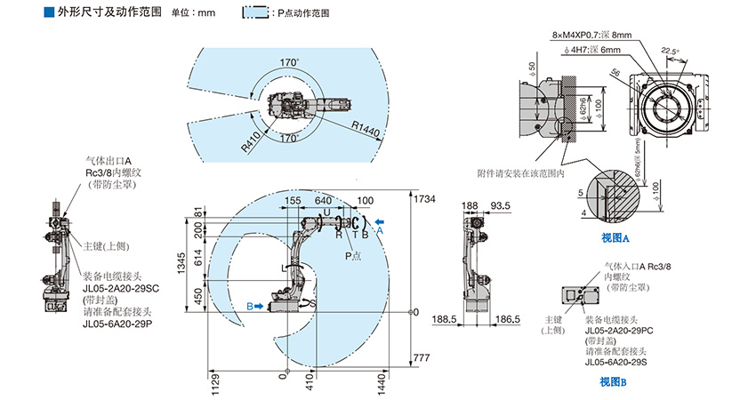 生产效率大幅度提升 ●合成速度比原有机型提升约30% 实现节拍时间缩减 ●采用了减小手臂与周边设备的干涉的设计 ●采用中空手臂构造,可将传感线缆以及气体管道内置其中 抗干扰的坚固构造 ●机器人手腕部分采用IP67标准 ●可对应接头基座面向下引出 提升维护性 ●减少了机器人与控制柜间的电缆线数,提升了维护性的同时提供简洁的设备 ● 大幅度缩减电缆定期更换作业时间